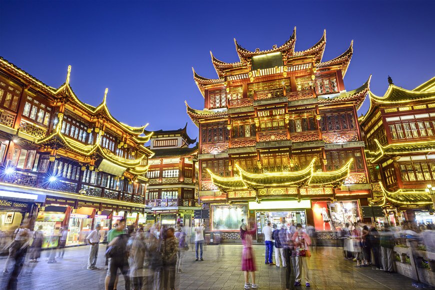 City God Temple includes Yu Garden, souvenir and food shops, and the temple. In the Ming Dynasty (1368–1644), Yu Garden and City God Temple were a private garden and a Taoist temple. Today, it's a popular tourist area. As night falls, the whole street becomes golden and amazing to look at.